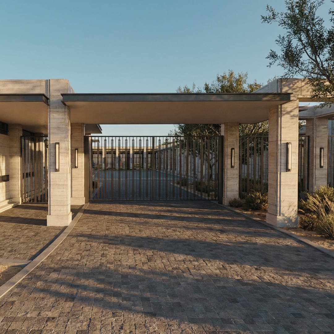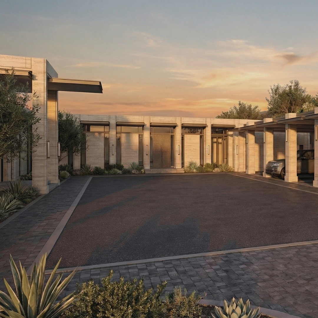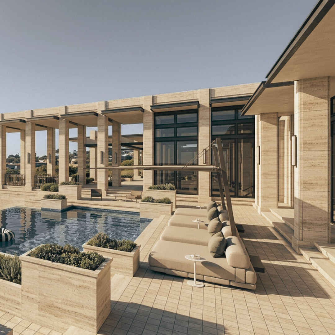Minimalist in language yet deeply expressive, the residence embraces a restrained palette of concrete and stone, allowing texture, light, and form to take center stage.