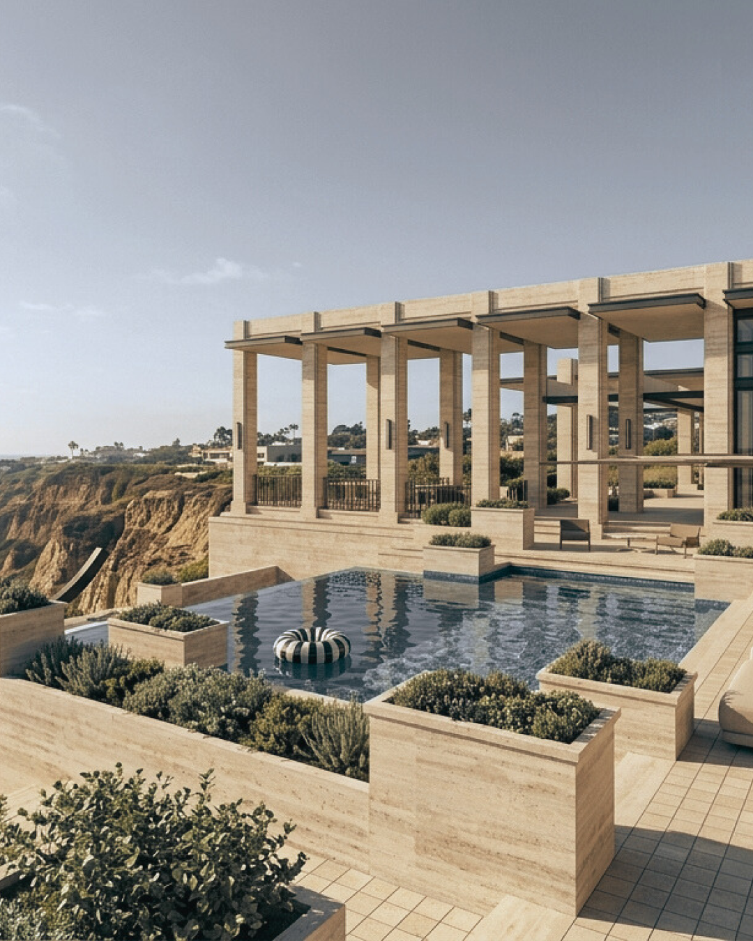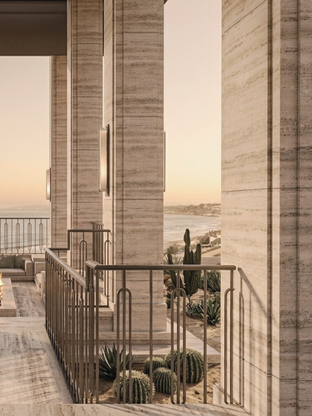 The facade unfolds through a precise interplay of geometries, where solid masses and open colonnades create rhythm and visual tension. Floor-to-ceiling glass dissolves the boundary between interior and exterior, capturing uninterrupted views of the ocean while inviting natural light to wash over surfaces, casting soft, ever-changing shadows throughout the day.