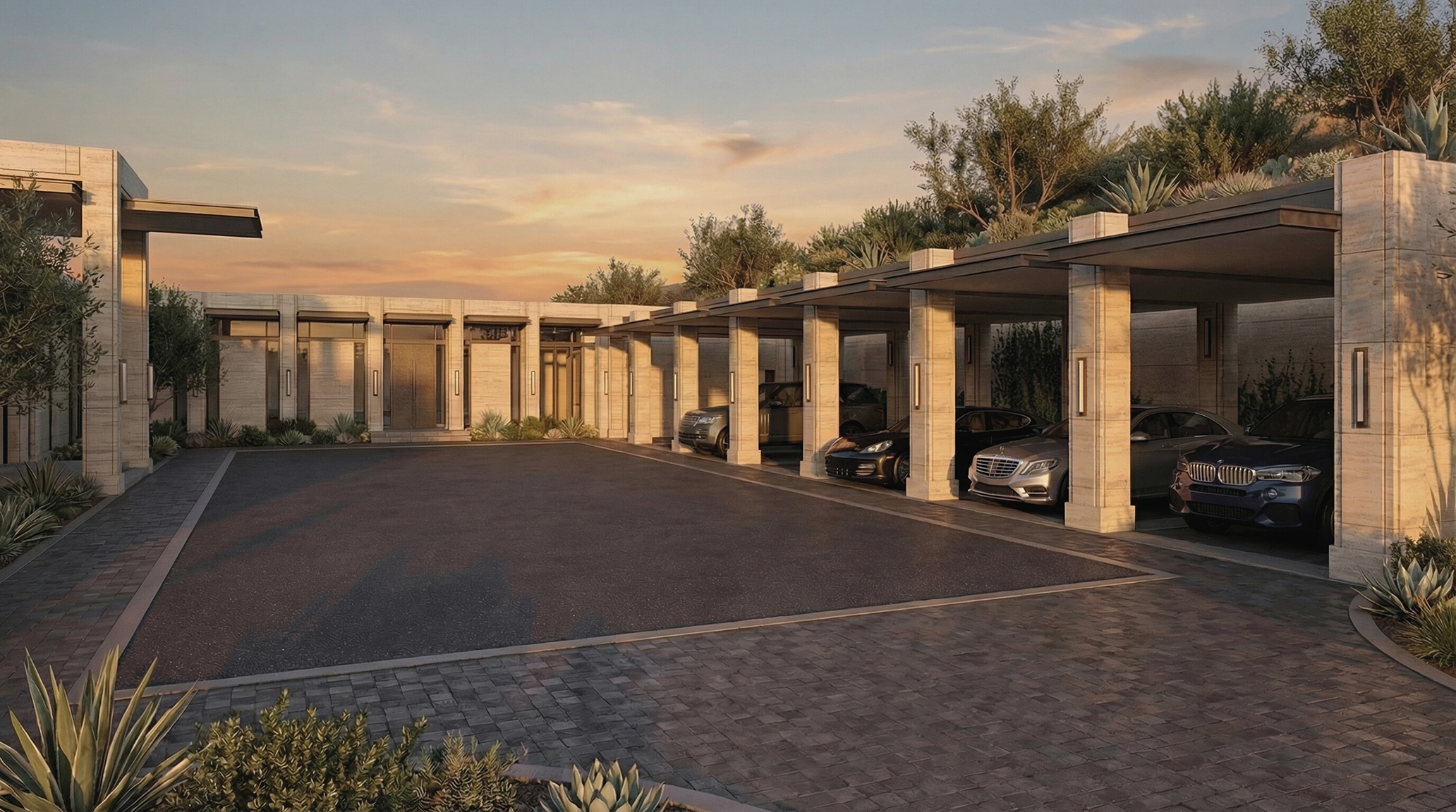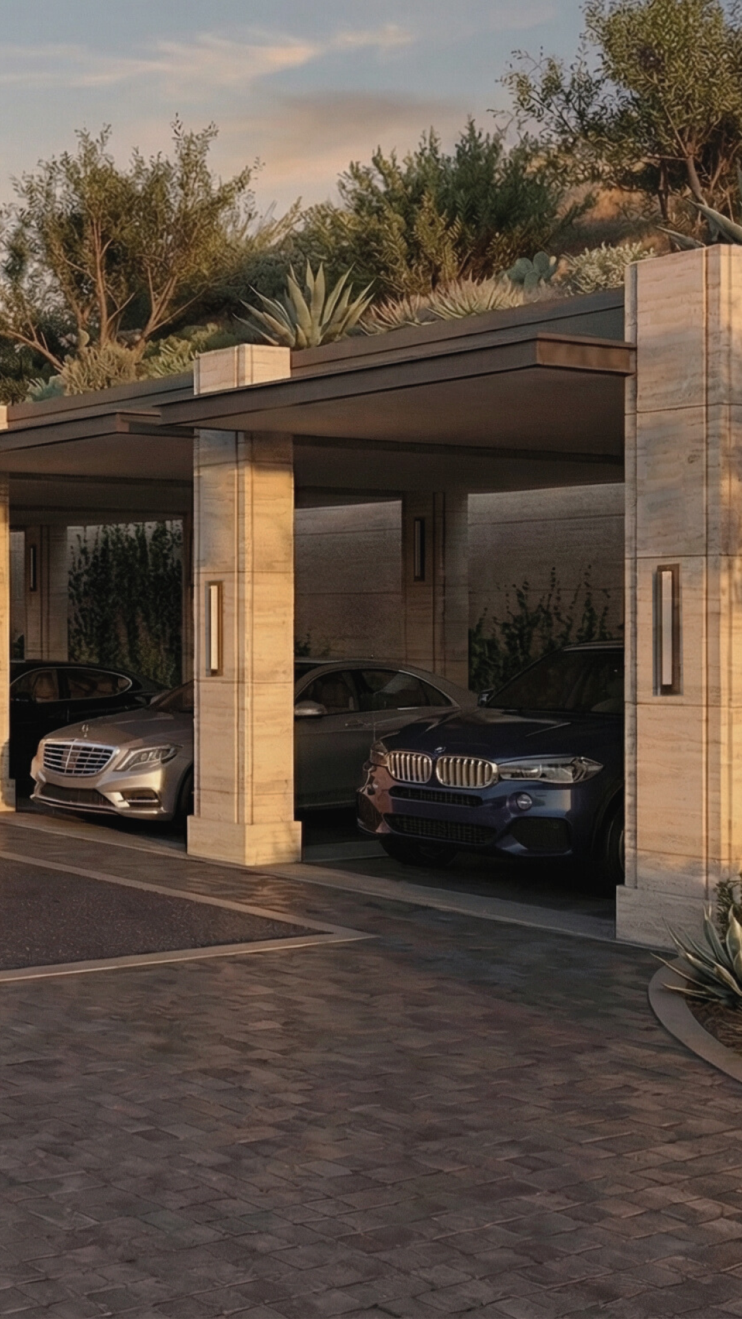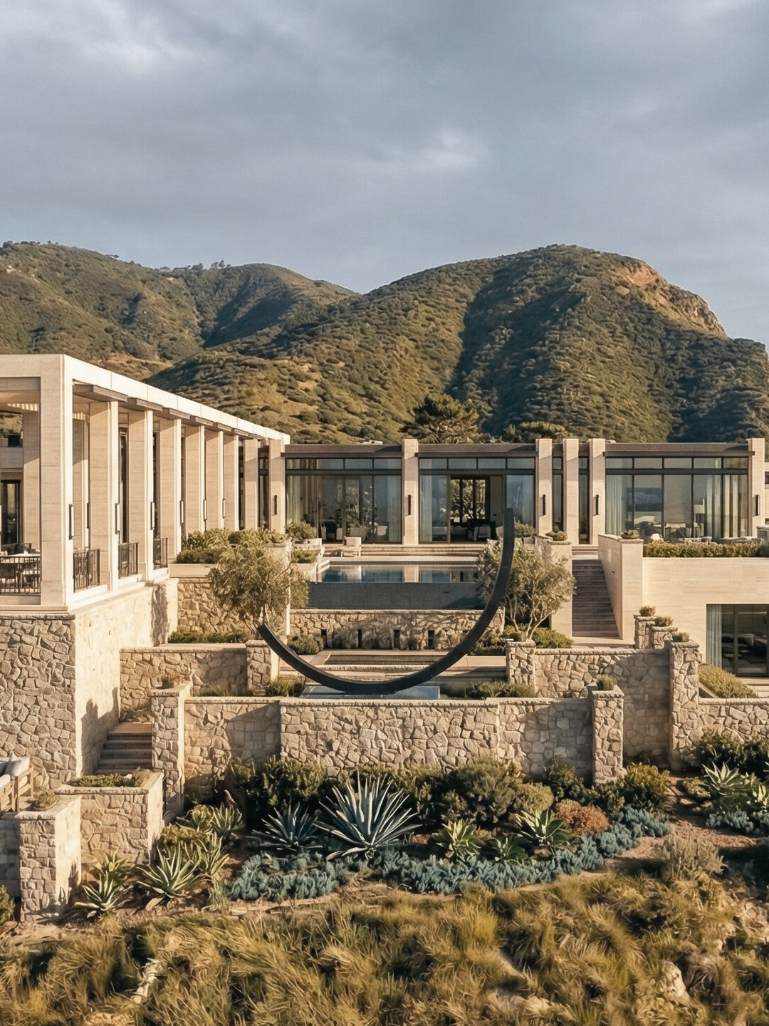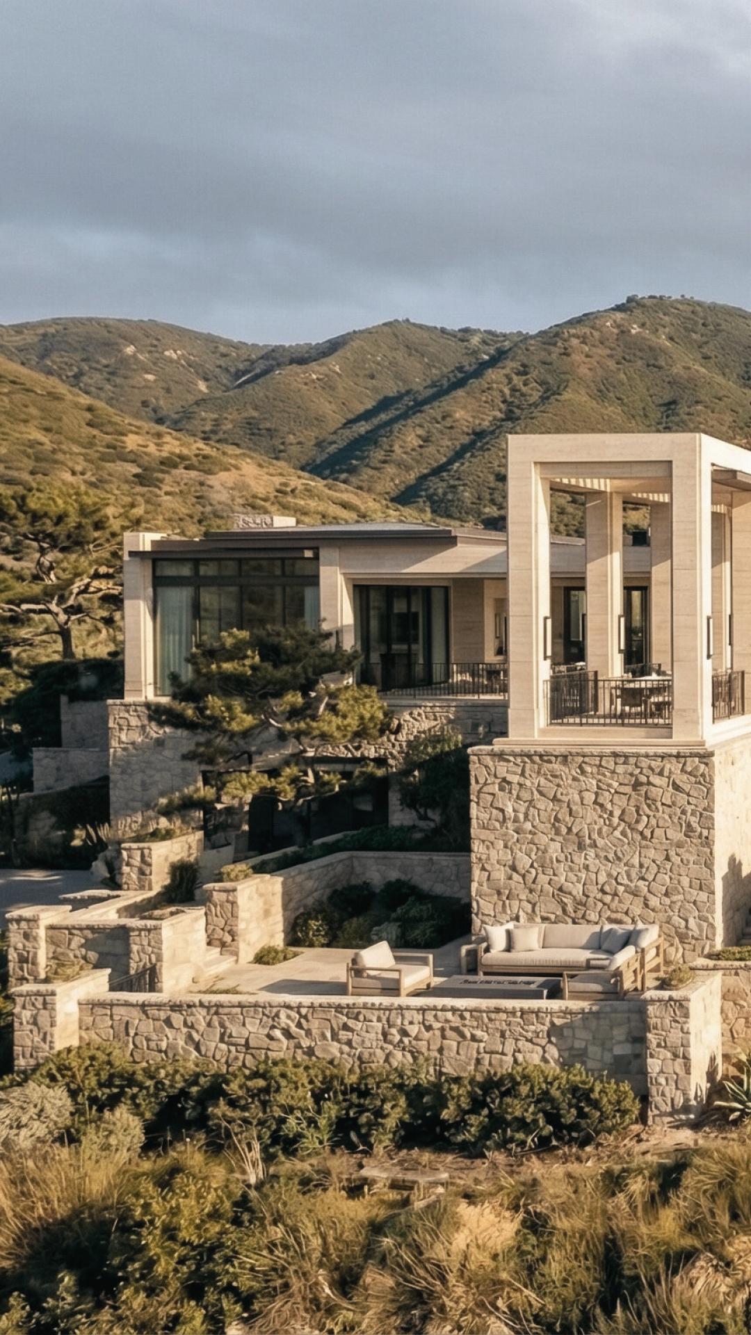 Terraces and retaining walls, carved in natural stone, anchor the structure to the rugged terrain, while winding pathways and desert xeriscape landscaping reinforce a dialogue with the surrounding environment. Every element feels intentional, grounded, and in quiet conversation with the hillside.