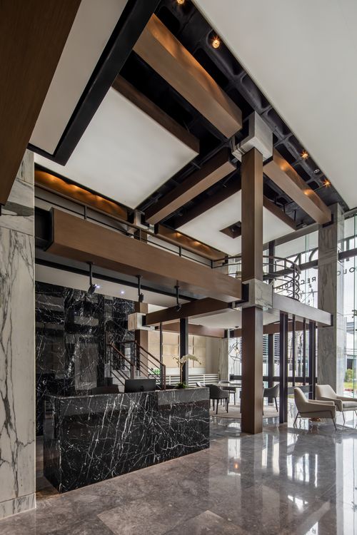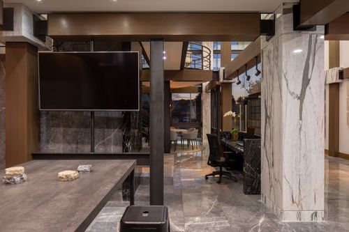 The Stonia showroom, specializing in exquisite marbles and natural stone finishes, invites clients to experience materials in their purest form. Marble surfaces adorn walls, floors, and the reception desk, highlighting the beauty of natural stone. The neutral color palette, inspired by the stones themselves, complements materials like wood, glass, and steel. Innovative display structures allow clients to explore the various treatments of each stone, while a custom drawer unit conveniently houses larger samples for easy access. The mezzanine accommodates staff offices, designed with light wood flooring and minimal partitions to enhance openness. The showroom includes two conference rooms, a restroom for employees, and a kitchenette, fostering a dynamic and efficient workflow.